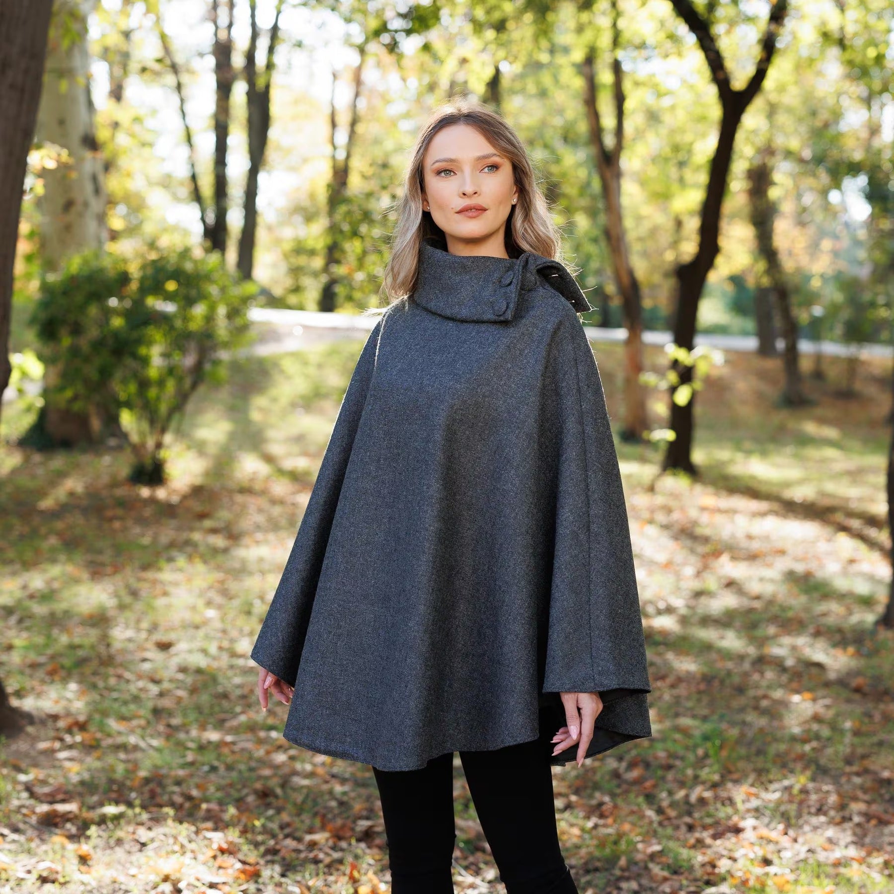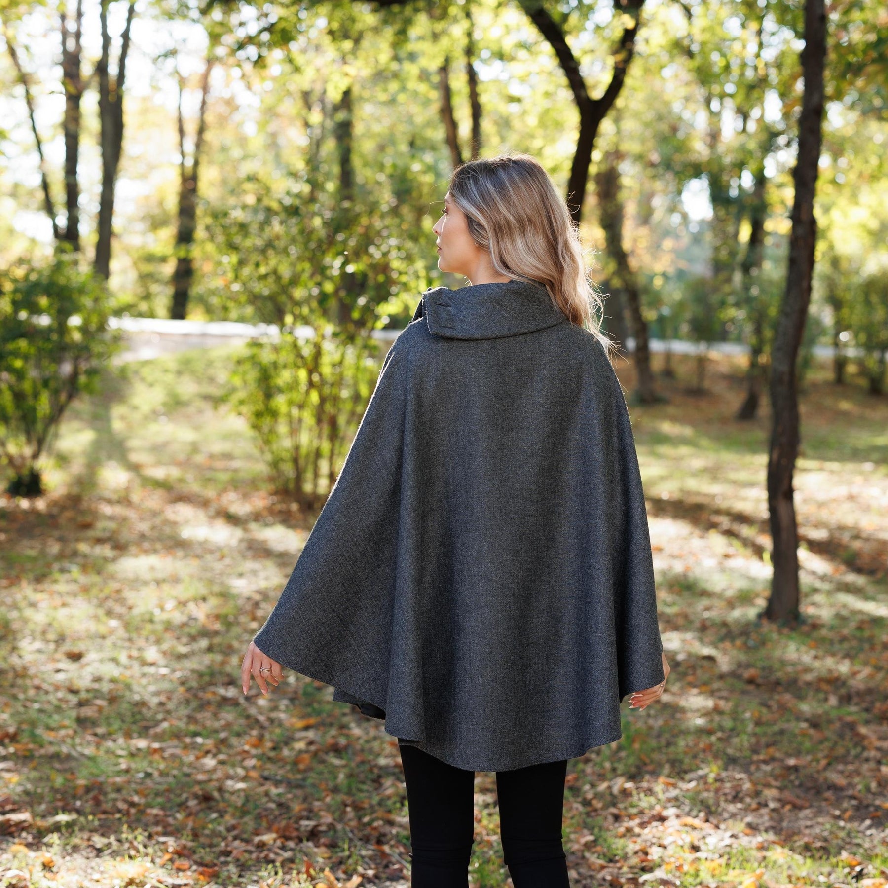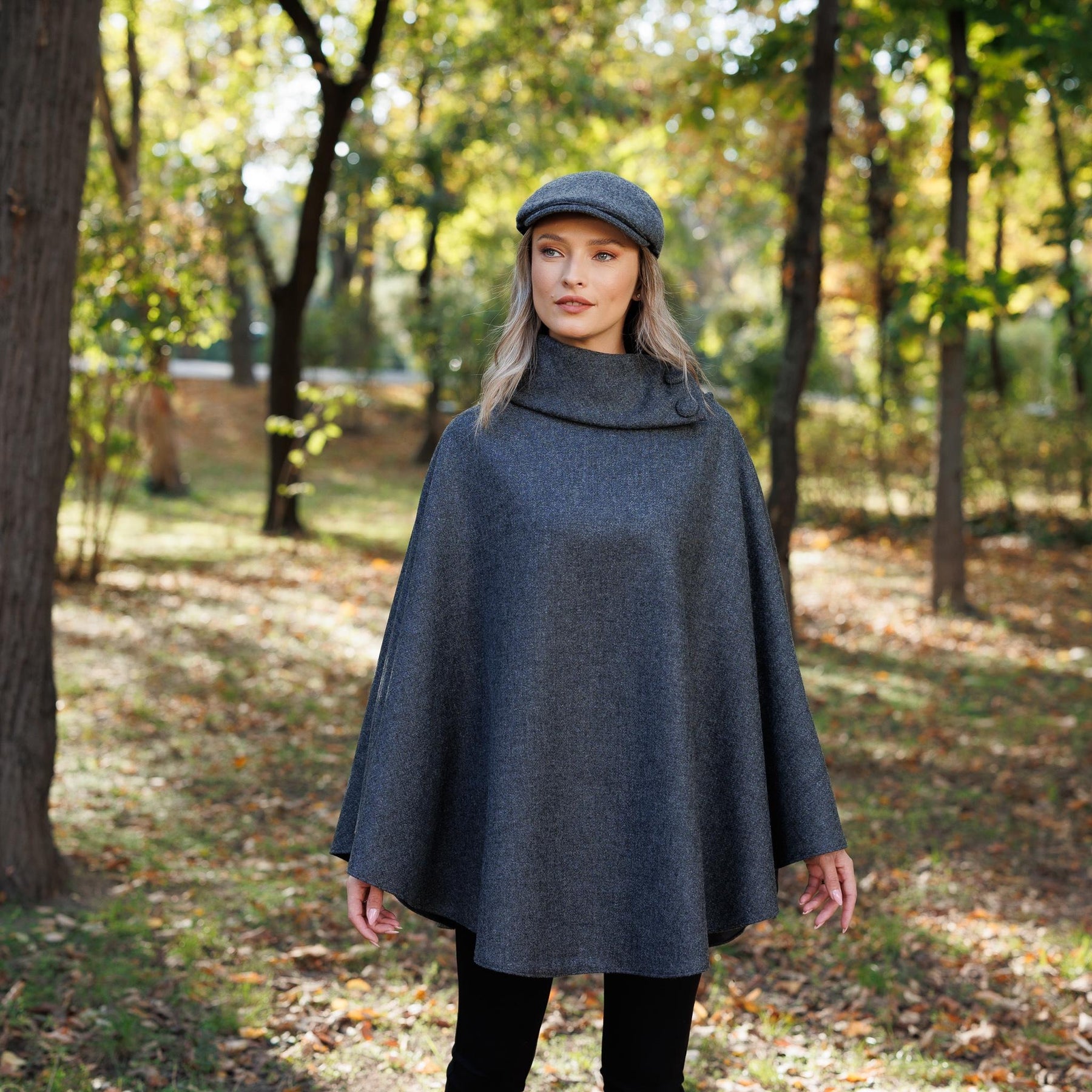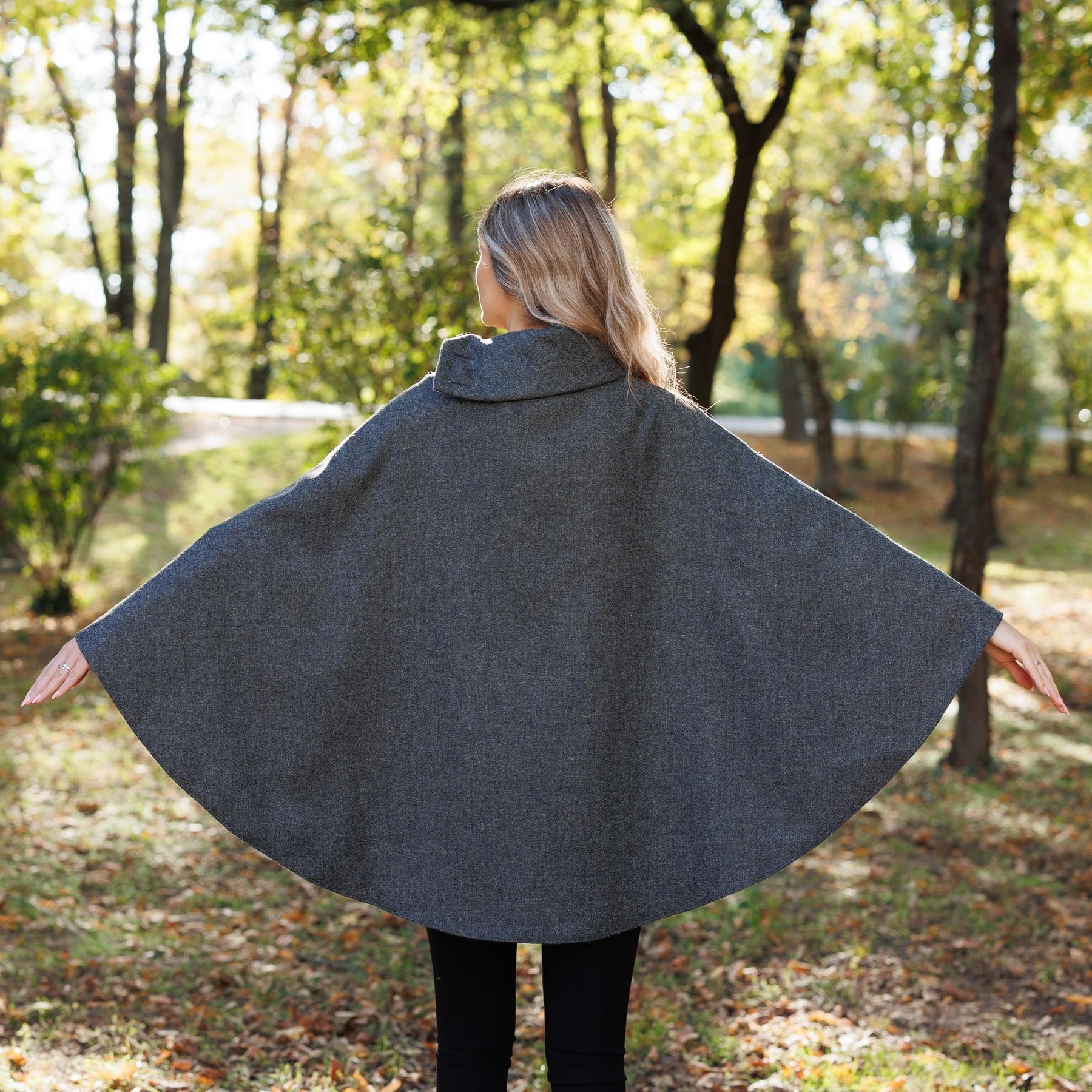 This Ladies Tweed Cape has a beautiful crafted button up collar, for endless styling, the cape is fully lined. This piece is a winter favourite.Simple and  yet so elegant and Timeless.